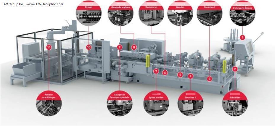 Machine Features: * Modular concept (Machine design with current & future customer requirements * Multi stations can be configures for various functions such as: heading, single/double end, pointing, threading, reducing, punching, pinching, pointing, extruding, milling, packaging, & more.